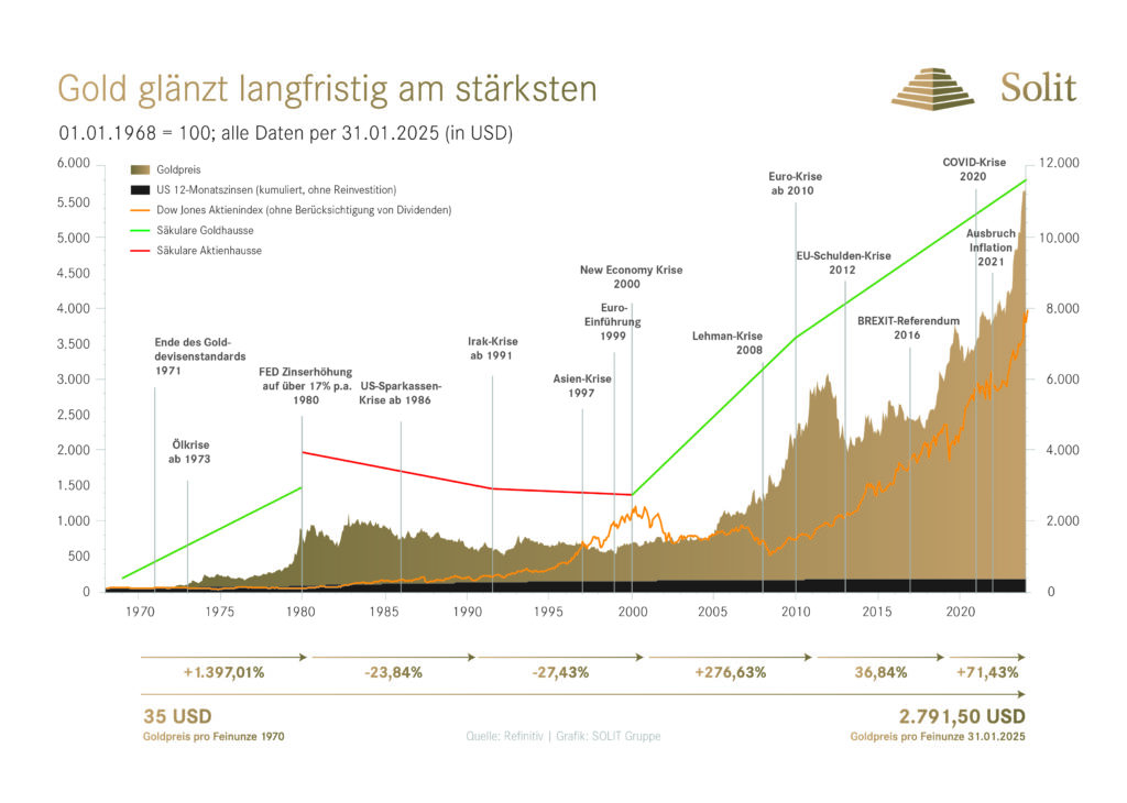 Edelmetalle wie Gold und Silber haben sich auch in Krisenzeiten als sichere Anlage erwiesen. Wer 1970 in ein Goldnugget oder einen Silberbarren investiert hat, freut sich heute über die enorme Wertsteigerung.
